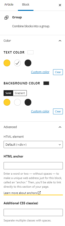 You can now insert blocks inside of the group, and use the group settings to control the look and feel of all the blocks inside of it.