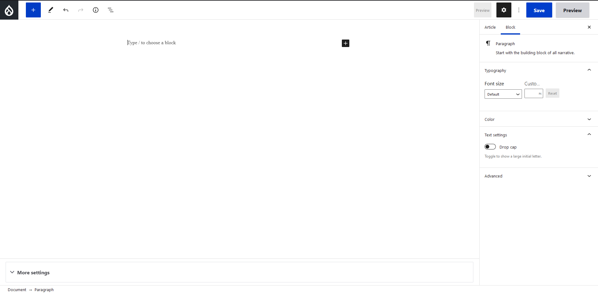 On the right side of the editor, you will see a column that contains more advanced settings for the currently selected block. Each block element has settings that are specific to that particular block which you can use to customize certain attributes. Take for example the paragraph settings:
