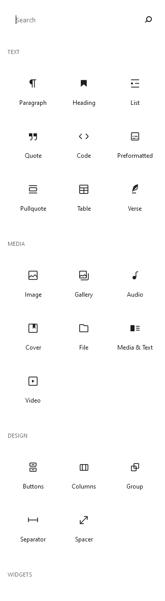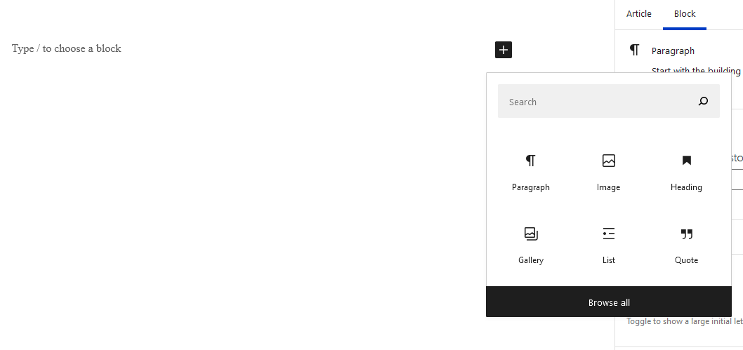 In the middle you will see the main content entry area. This is where you will enter content. You can start typing to create a paragraph block, or you can click the plus (+) icon to open the inline block browser. From here you can search for different block elements to insert: