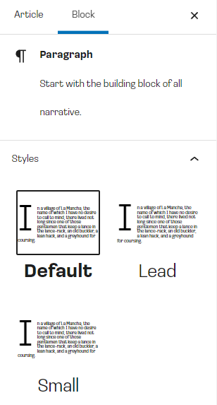 Adding additional styles works much the same way. Say you want to create additional paragraph styles. In our example, we will add two new styles, called "Lead" and "Small". To accomplish that we will use the registerBlockStyle method.
